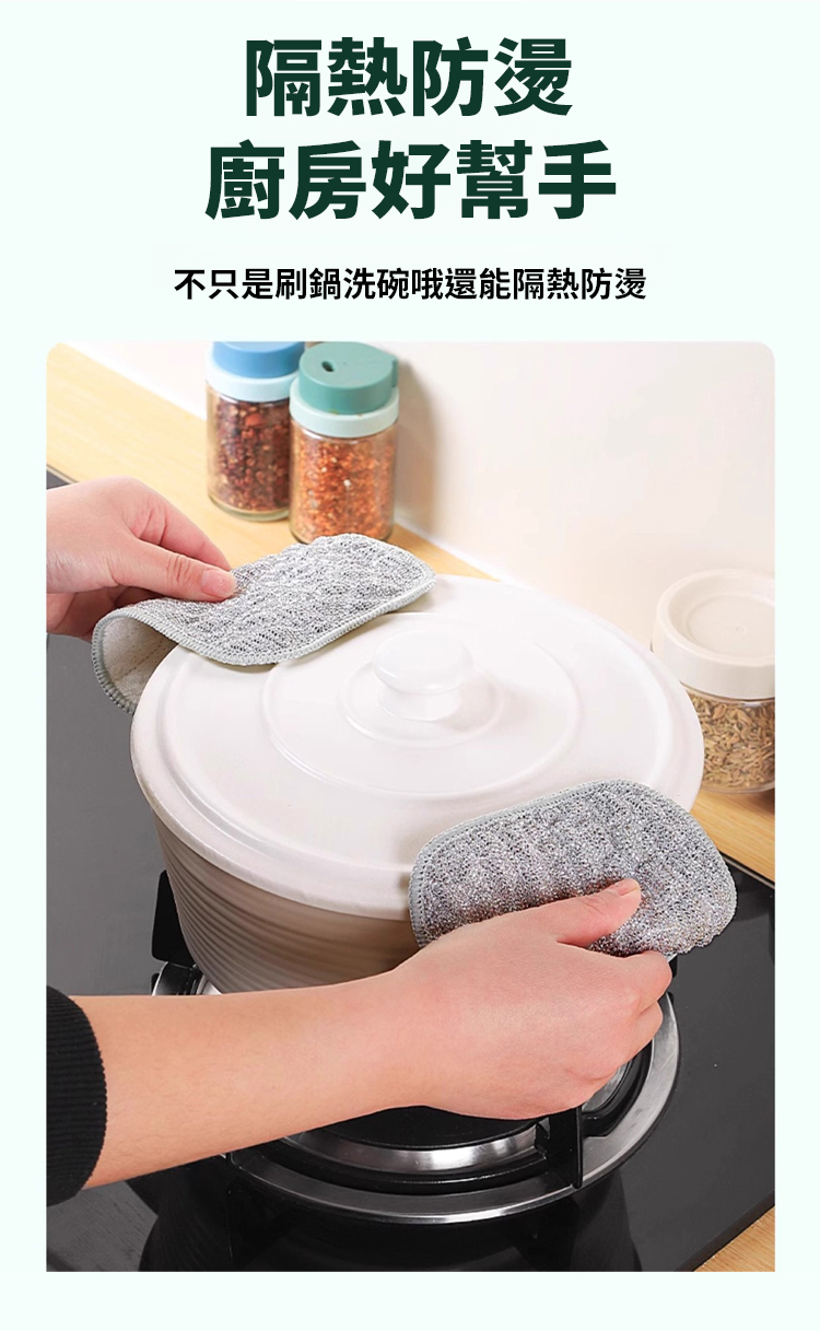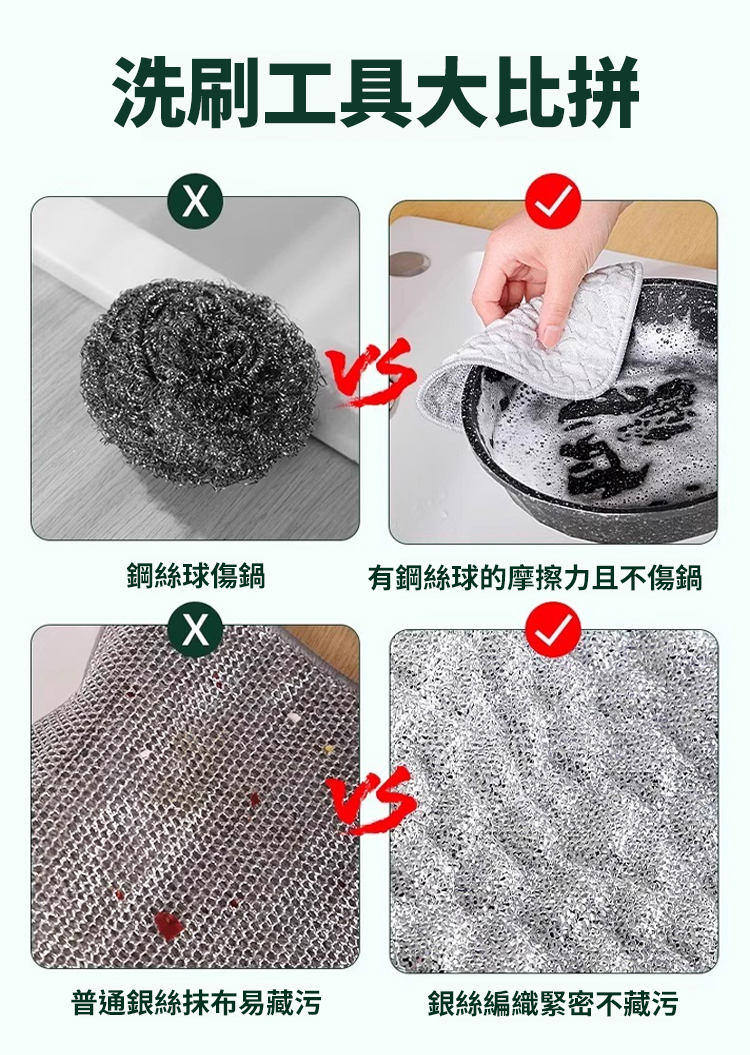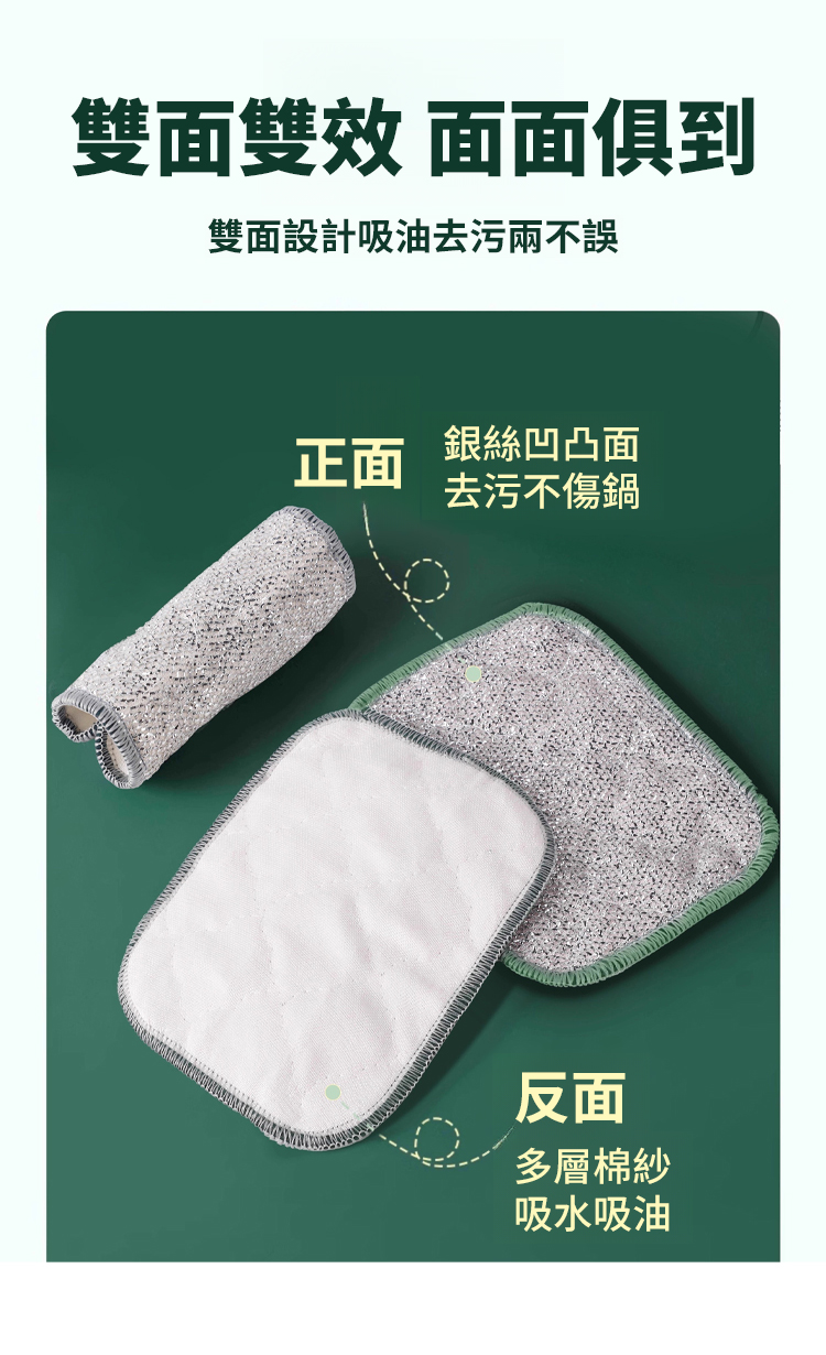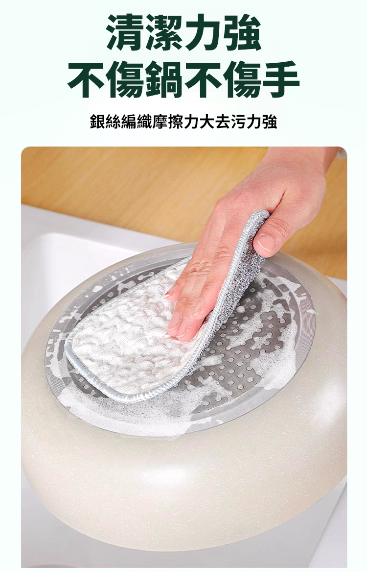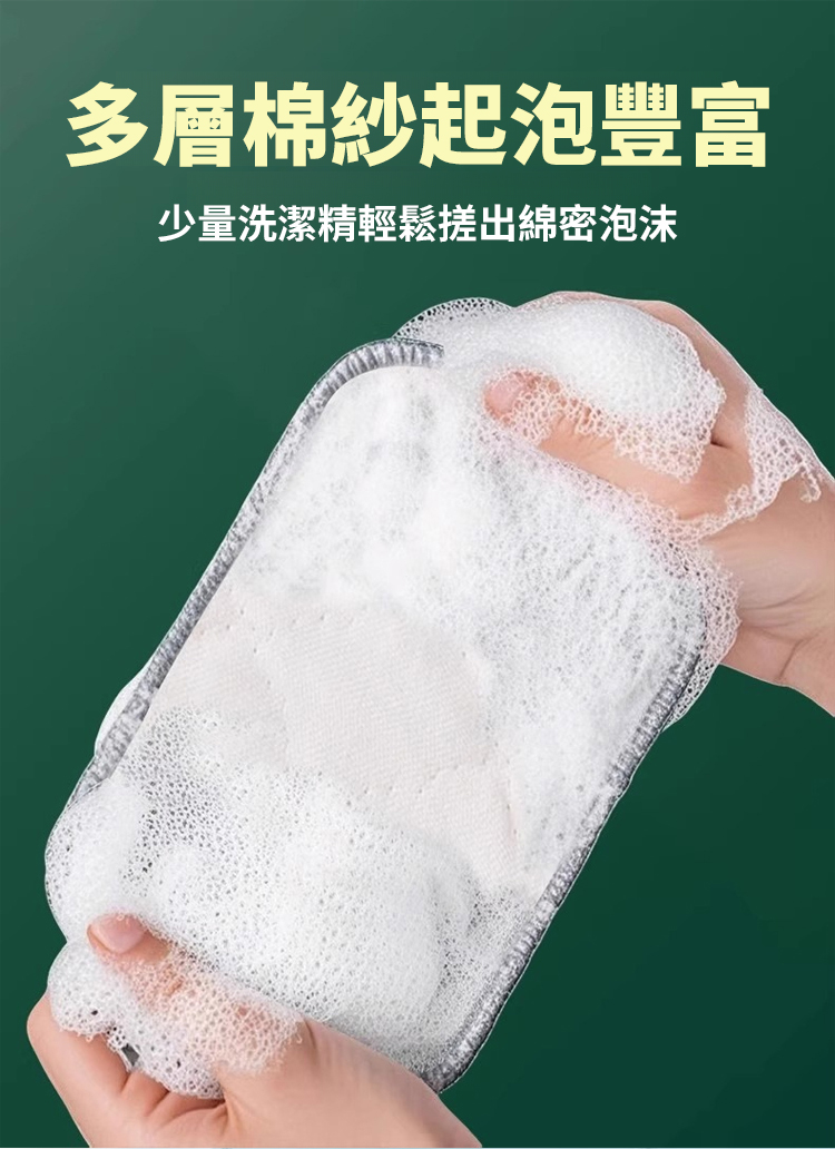 雙層銀絲棉紗材質,厚實不易掉絮,少量洗潔精就能搓出綿密泡沫,清潔更省力,刷鍋、洗碗、擦油煙機都能用,比鋼絲球更護鍋,還不傷手