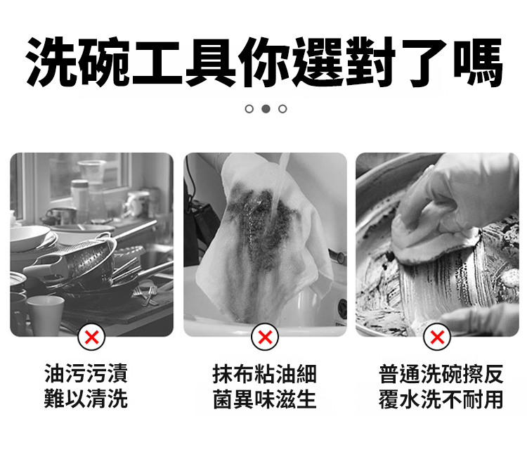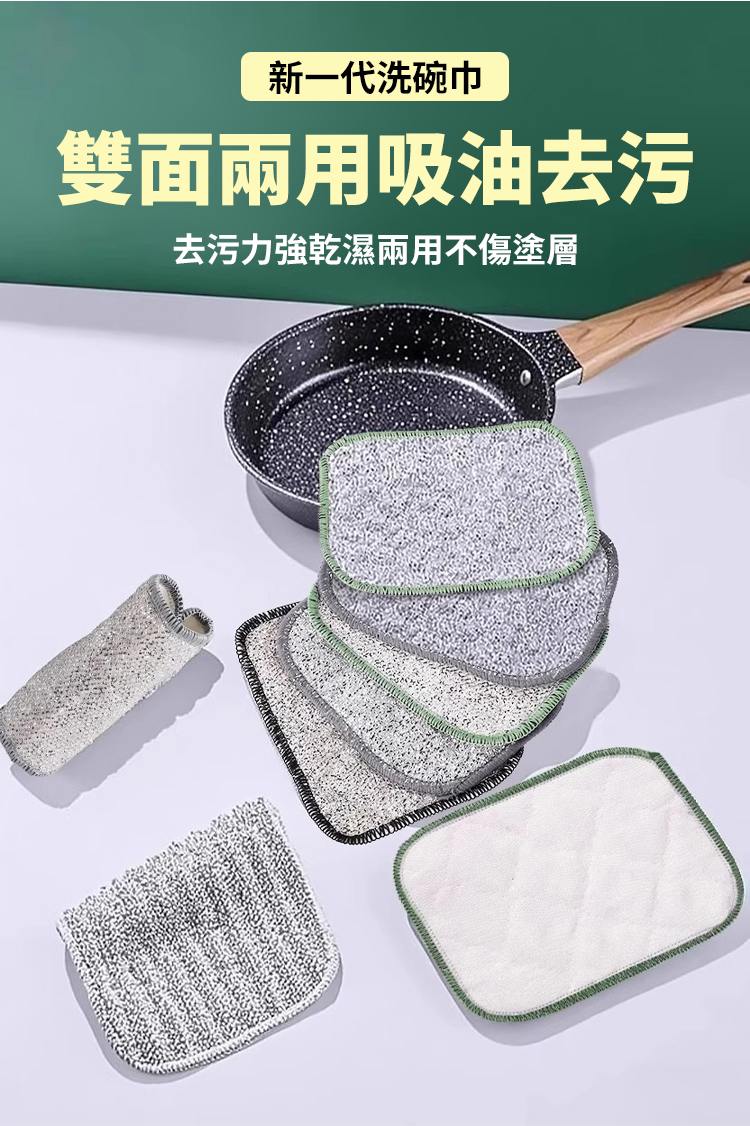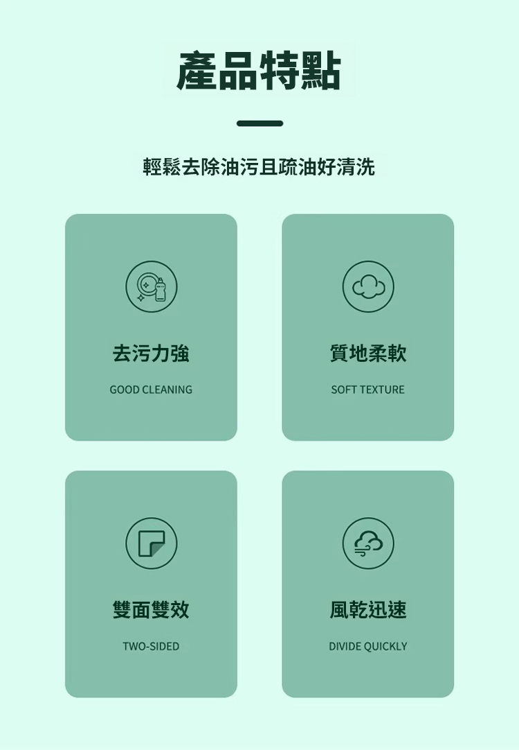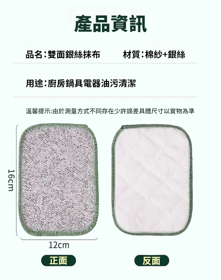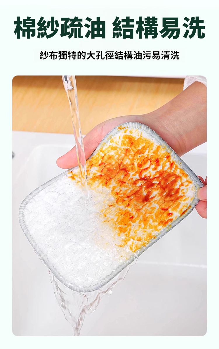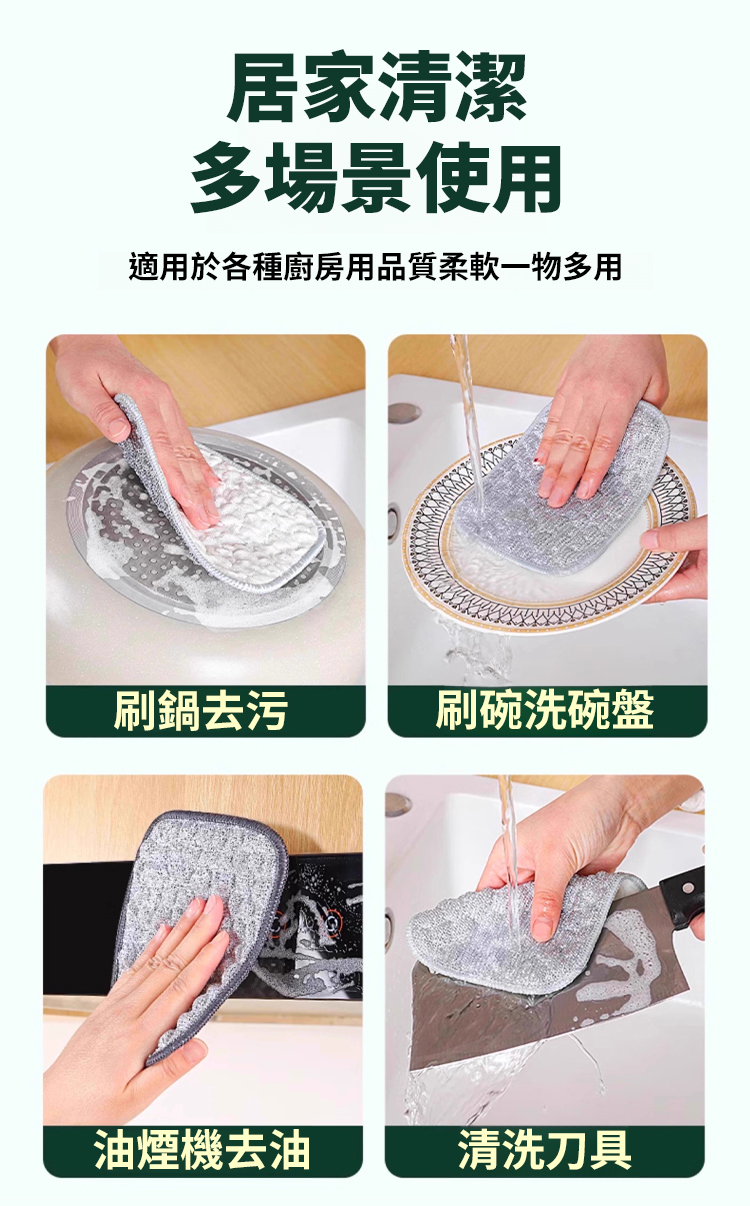 雙層銀絲棉紗材質,厚實不易掉絮,少量洗潔精就能搓出綿密泡沫,清潔更省力,刷鍋、洗碗、擦油煙機都能用,比鋼絲球更護鍋,還不傷手